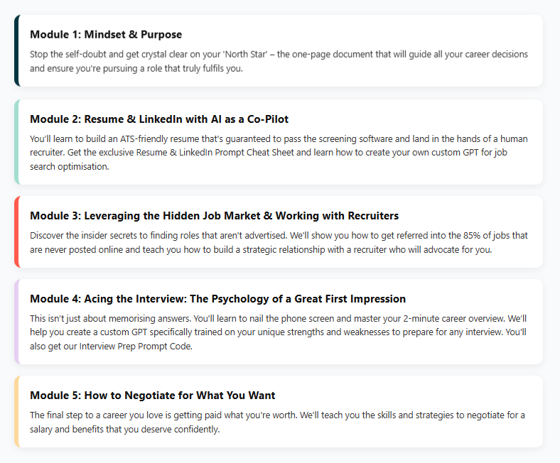 Perfect for those who need immediate tactics to land a role quickly. You’ll get the core AI tools and the 5-week curriculum to sharpen your brand and start pitching.